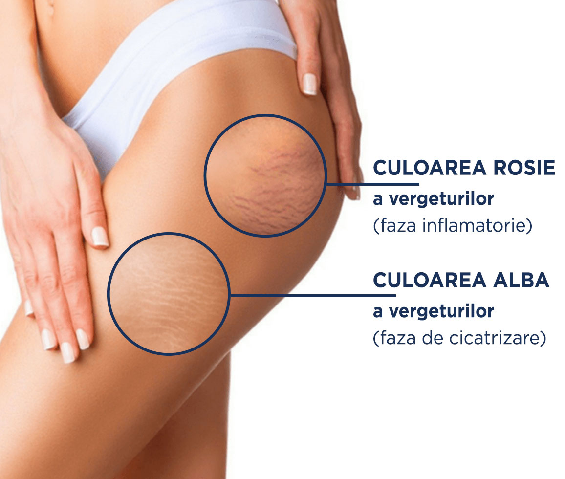 - Faza de cicatrizare: vergeturile devin albicioase, în timp ce suprafața nu mai este netedă.