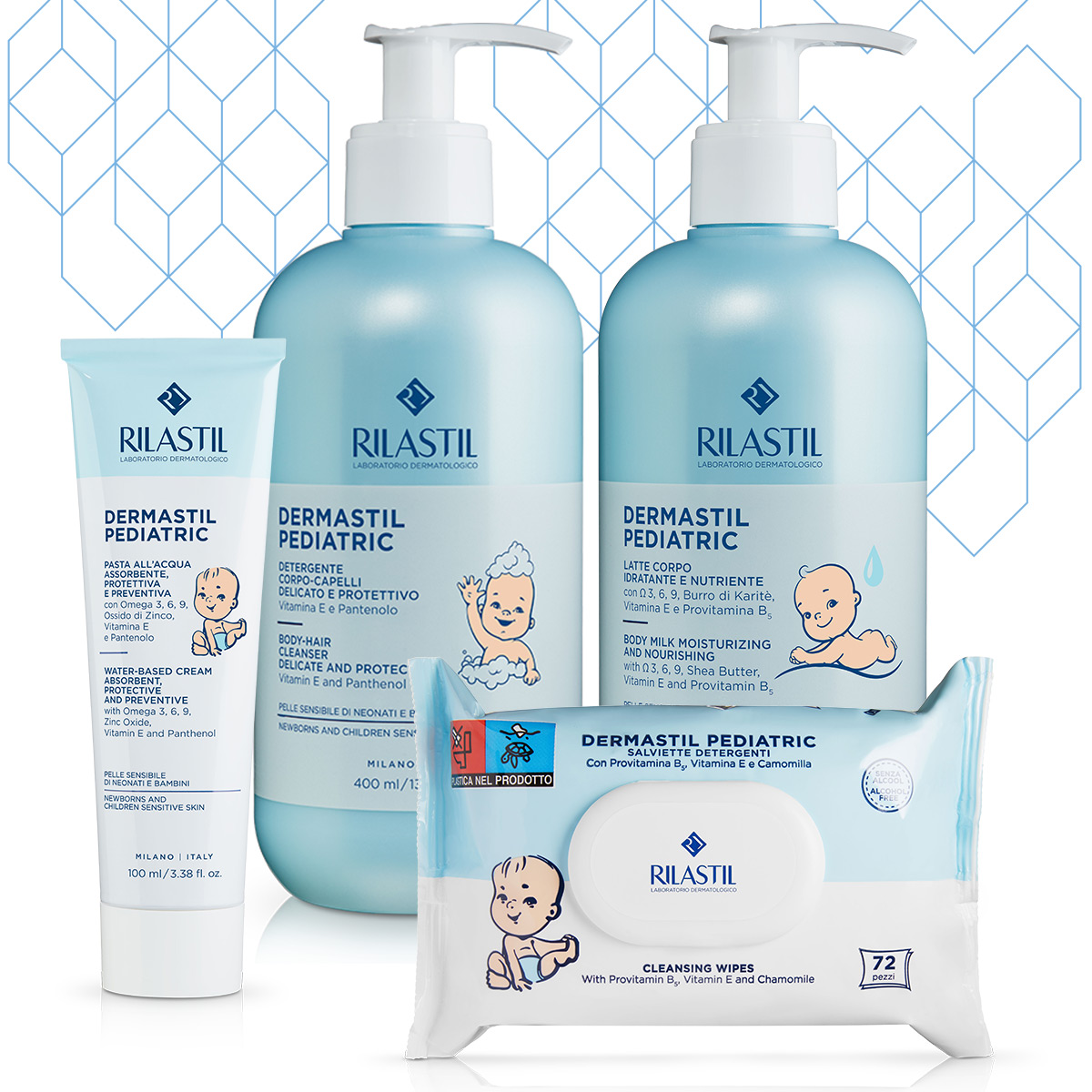 Prima linie pediatrică Rilastil care conţine Omega -3, -6 și -9, provitamina B5 și vitamina E, care ajută la protecția și îngrijirea pielii nou-născuților și copiilor, respectând şi păstrând filmul hidrolipidic.