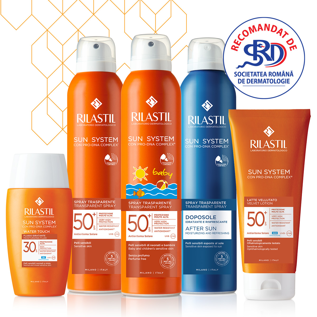 Produsele RILASTIL SUN SYSTEM ajută la prevenirea arsurilor şi petelor provocate de soare, stresului oxidativ și îmbătrânirii premature a celulelor, prin formulele care se potrivesc cel mai bine tipului de piele pe care îl aveţi şi care se pliază pe nevoile acestuia.