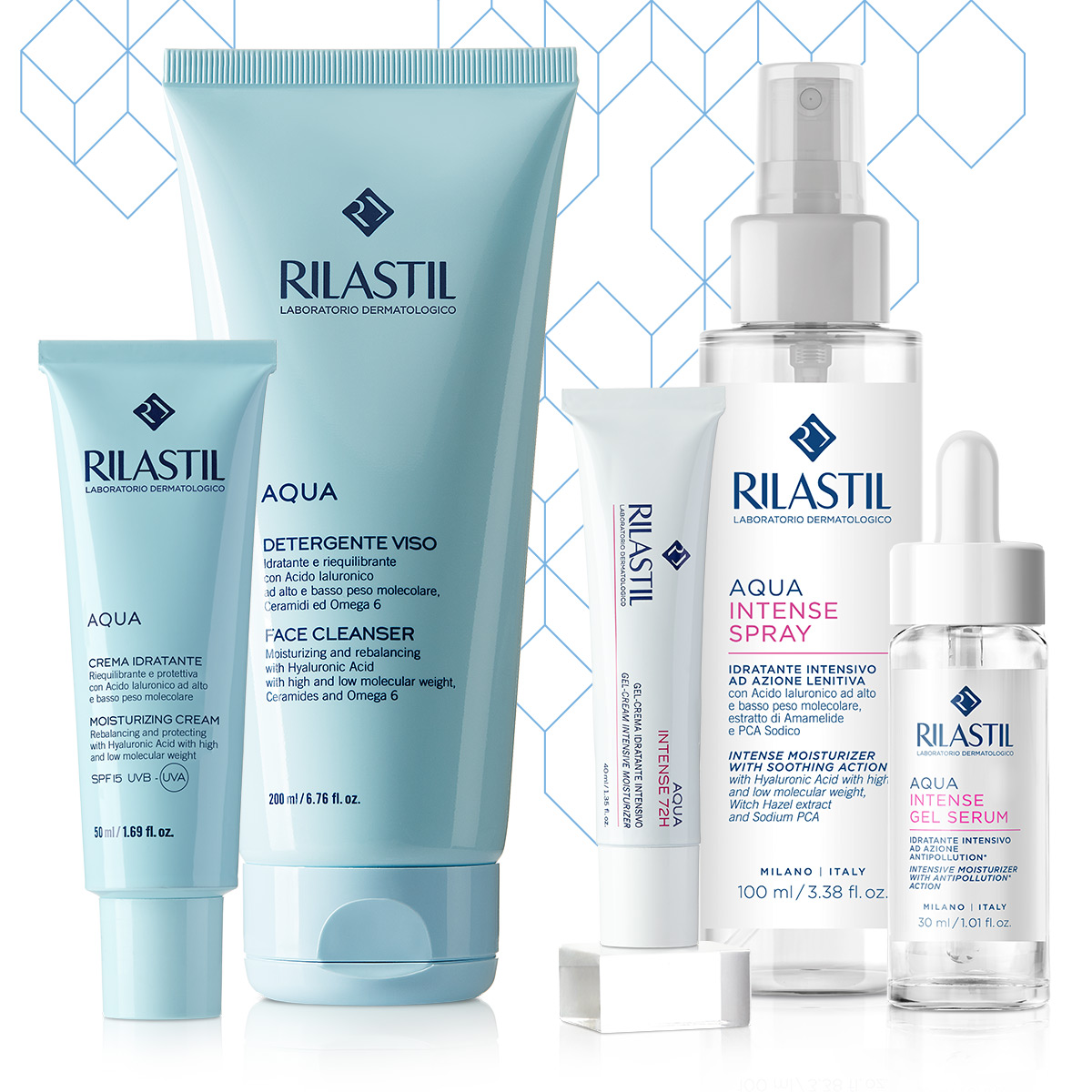 Linie completă pentru a oferi pielii o hidratare optimă. Rilastil Aqua are un sistem de hidratare intensiv bifuncțional: Acidul Hialuronic cu greutate moleculară mare (Hialuronat de sodiu) menține stratul superficial al pielii hidratat, în timp ce Acidul Hialuronic cu greutate moleculară mică (Acid hialuronic hidrolizat) hidratează profund pielea.