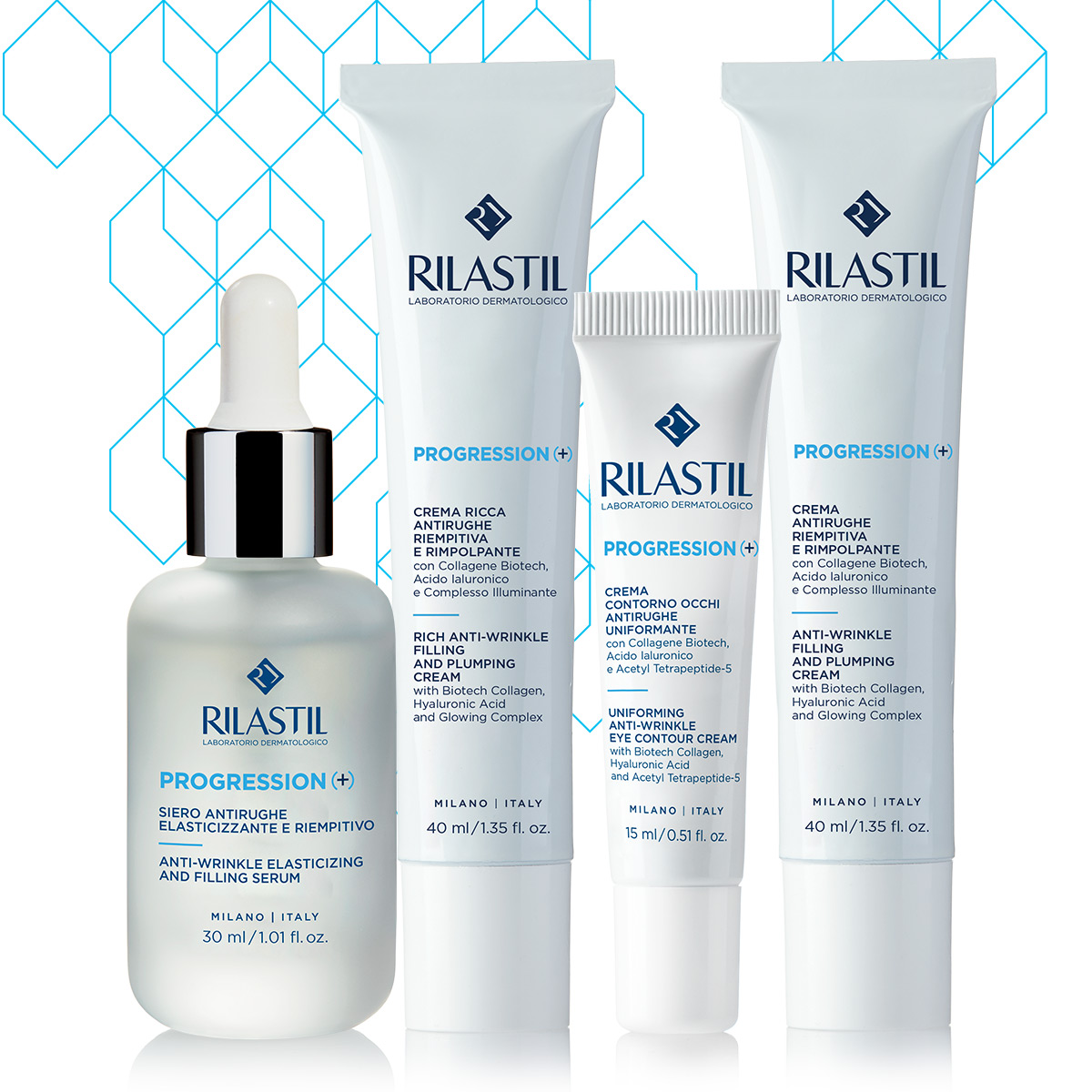 Rilastil Progression este gama specifică cu o concentrație mare de ingrediente active ce au o acțiune iluminatoare și de uniformizare a tenului cu riduri.